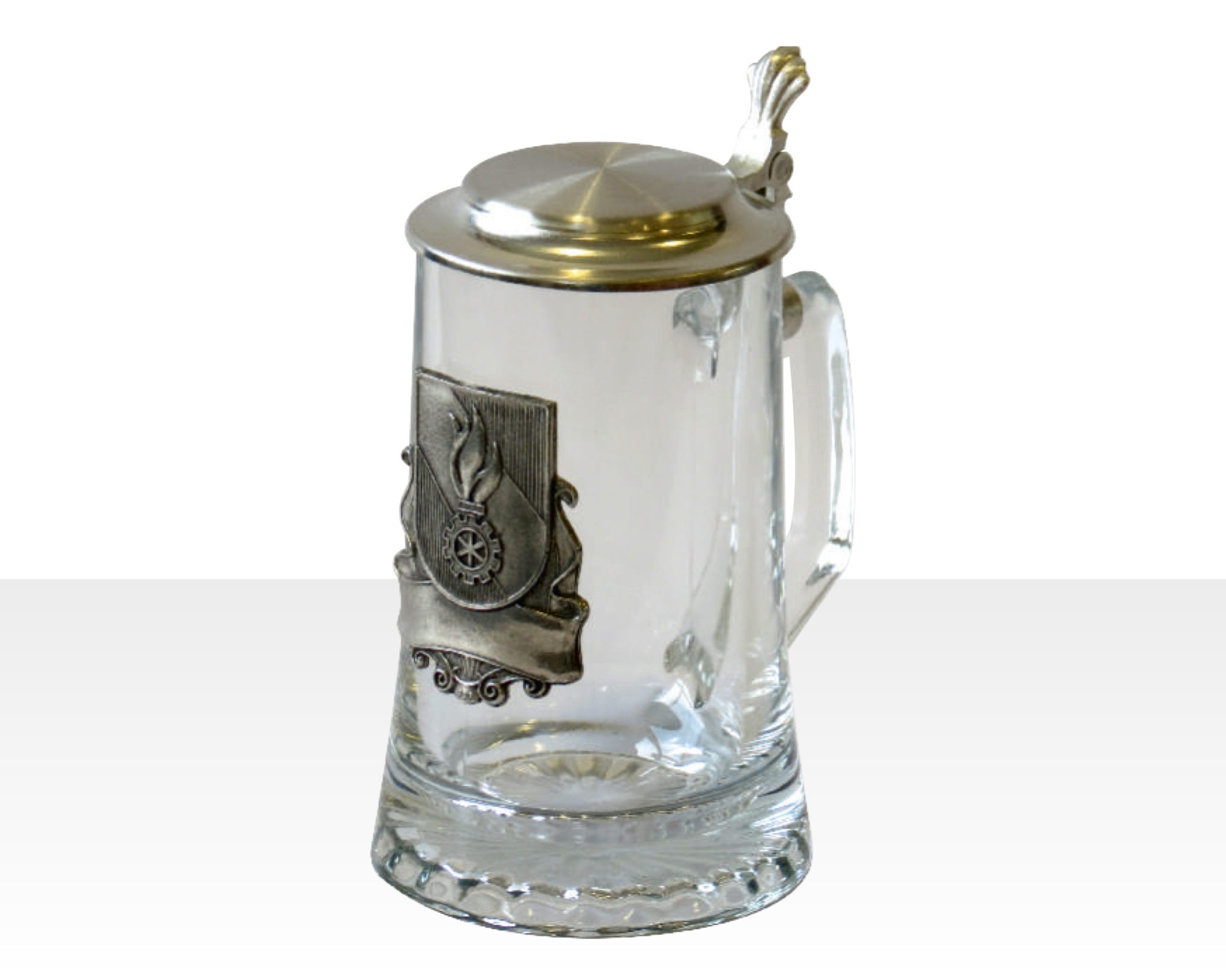 Mit dem Feuerwehrwappen und Deckel aus Zinn bekommt dieses Glas eine altmodische Optik. Wie bei den anderen Optionen ist auch hier eine Gravur auf dem Zinndeckel möglich.