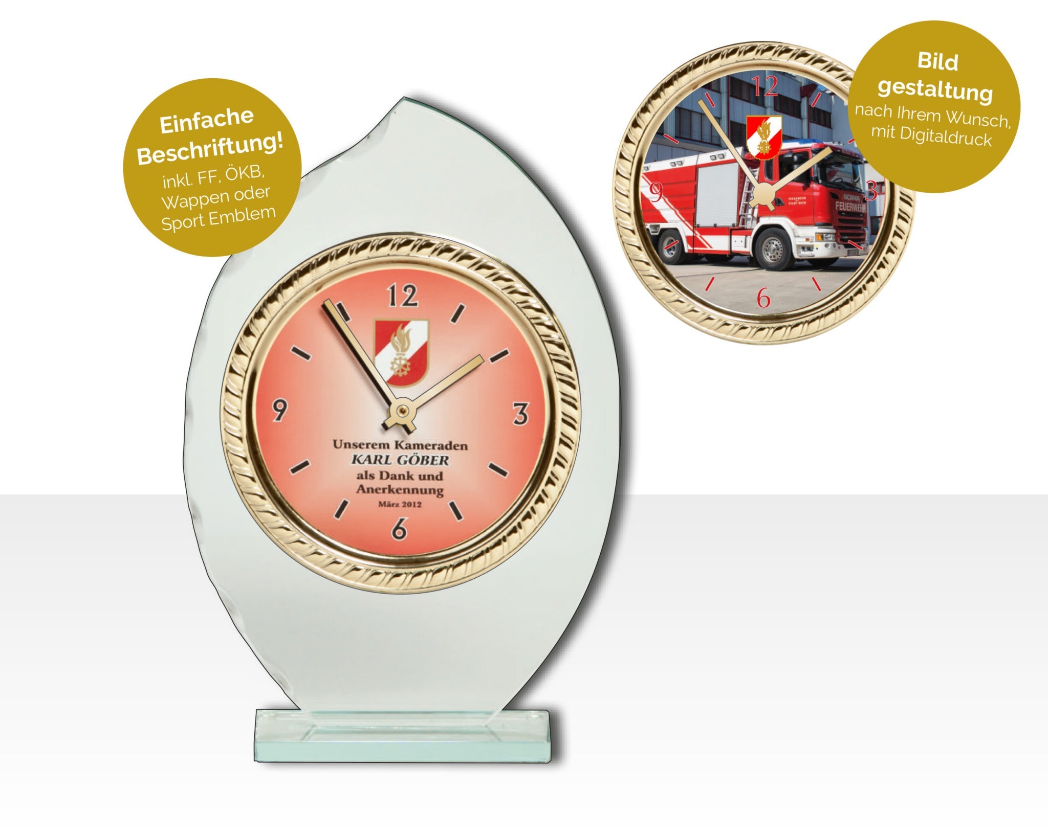 Die Kristallglas Uhr ist ein schönes, individuelles Geschenk für Verreine, Feuerwehren, ÖKB, Gemeinden oder auch für Geburtstage, Taufen und vieles mehr.