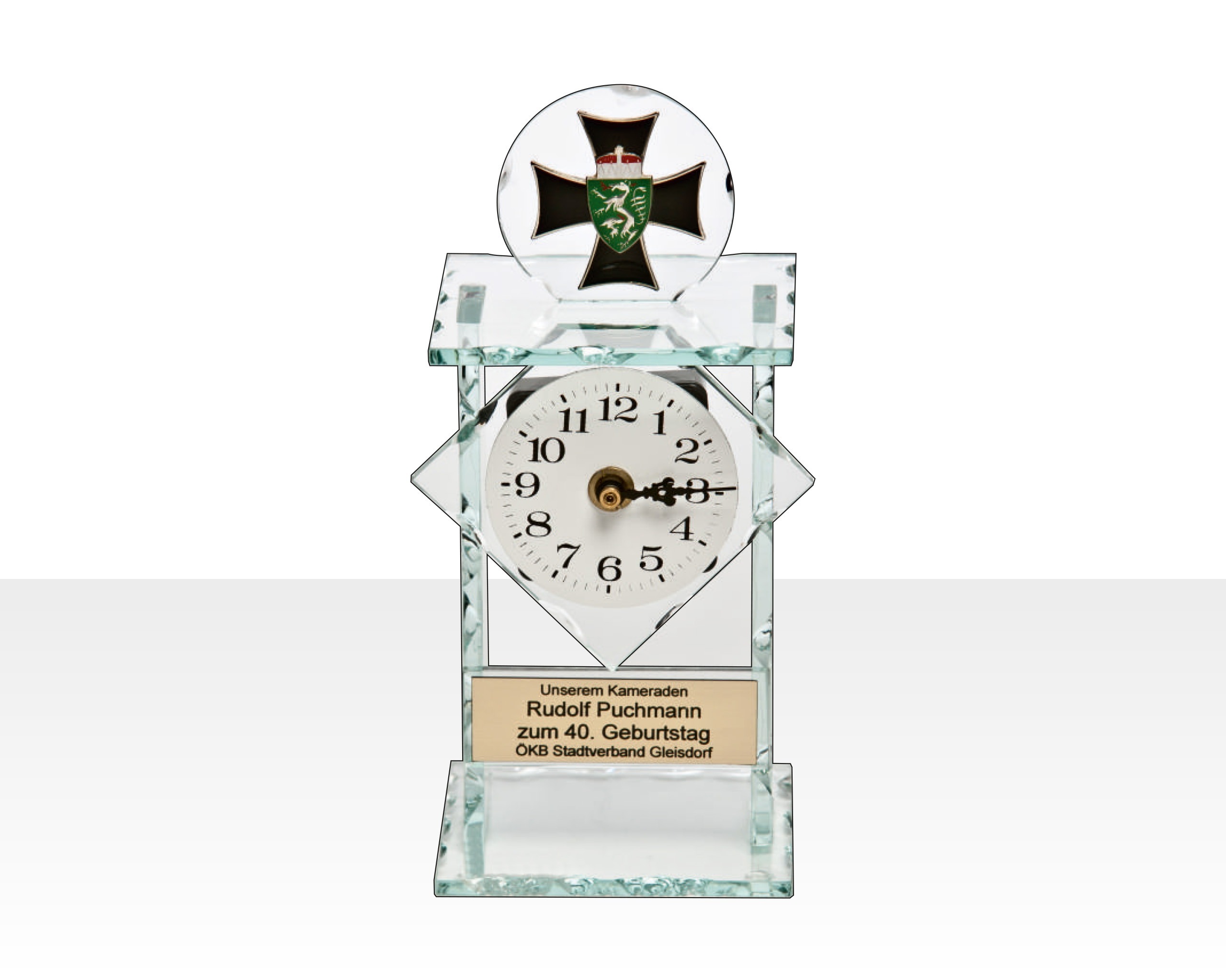 Die Kristallglas Uhr Kasten ist ein schönes, individuelles Geschenk für Verreine, ÖKB, Feuerwehren und vieles mehr.