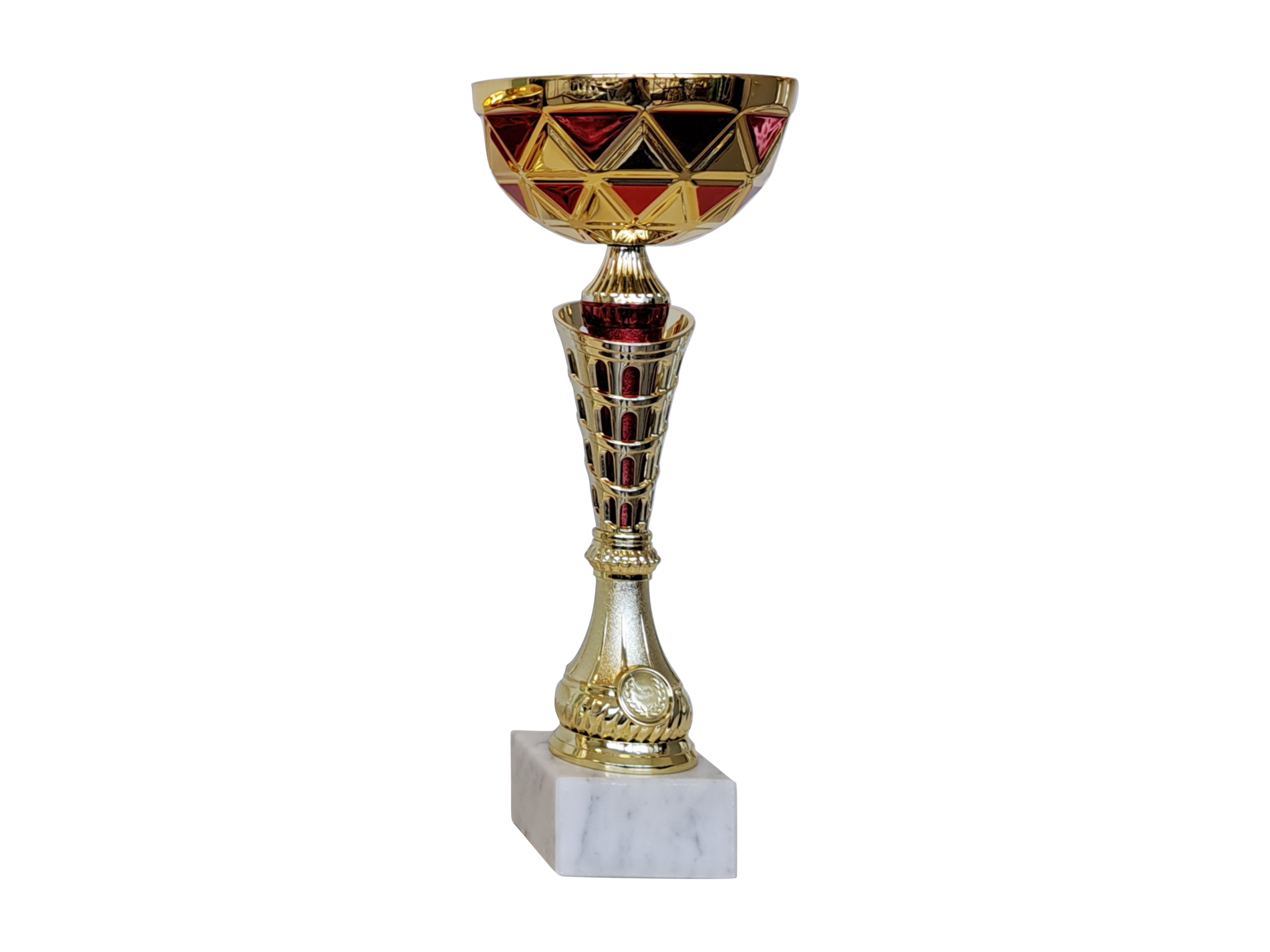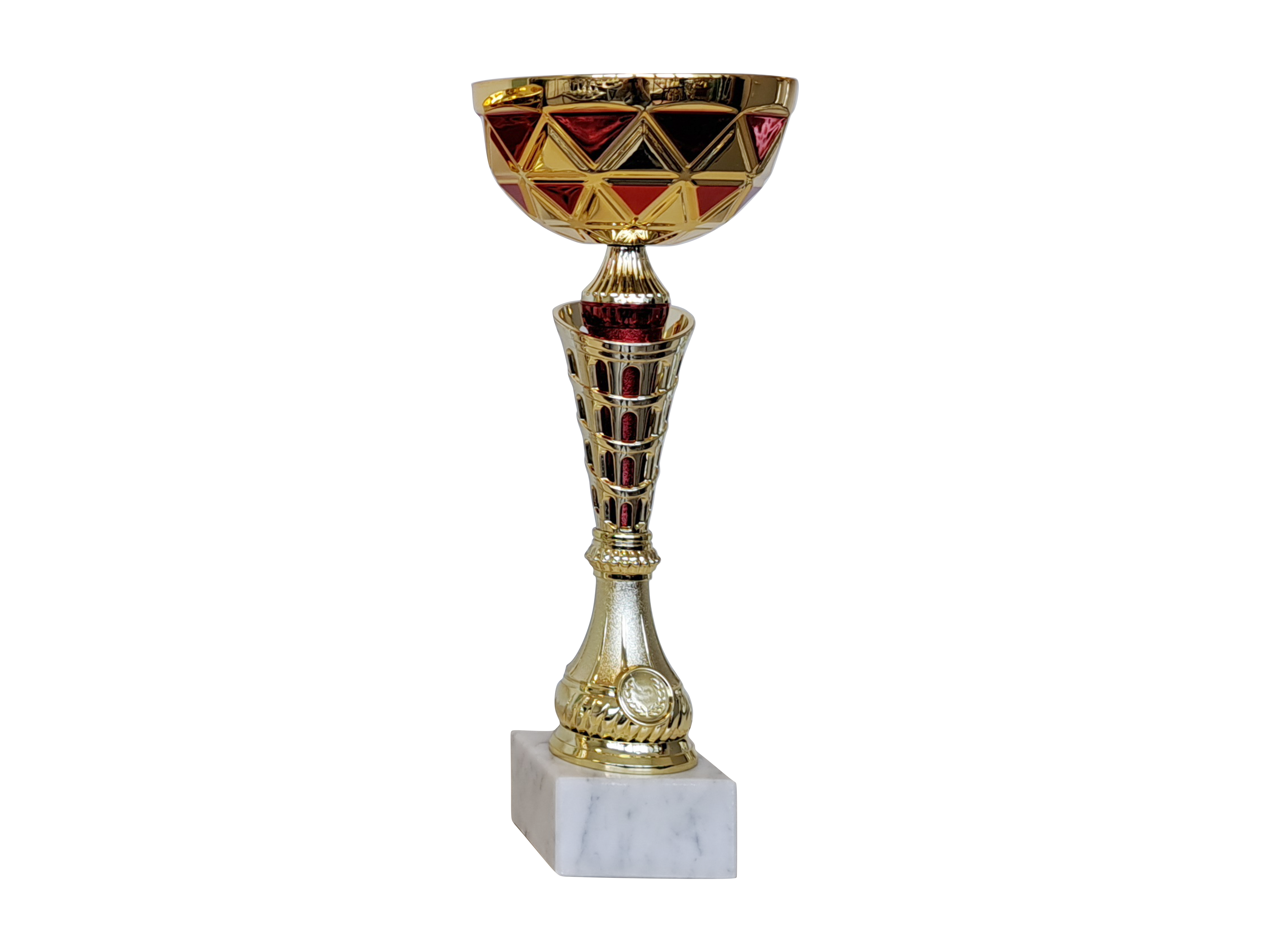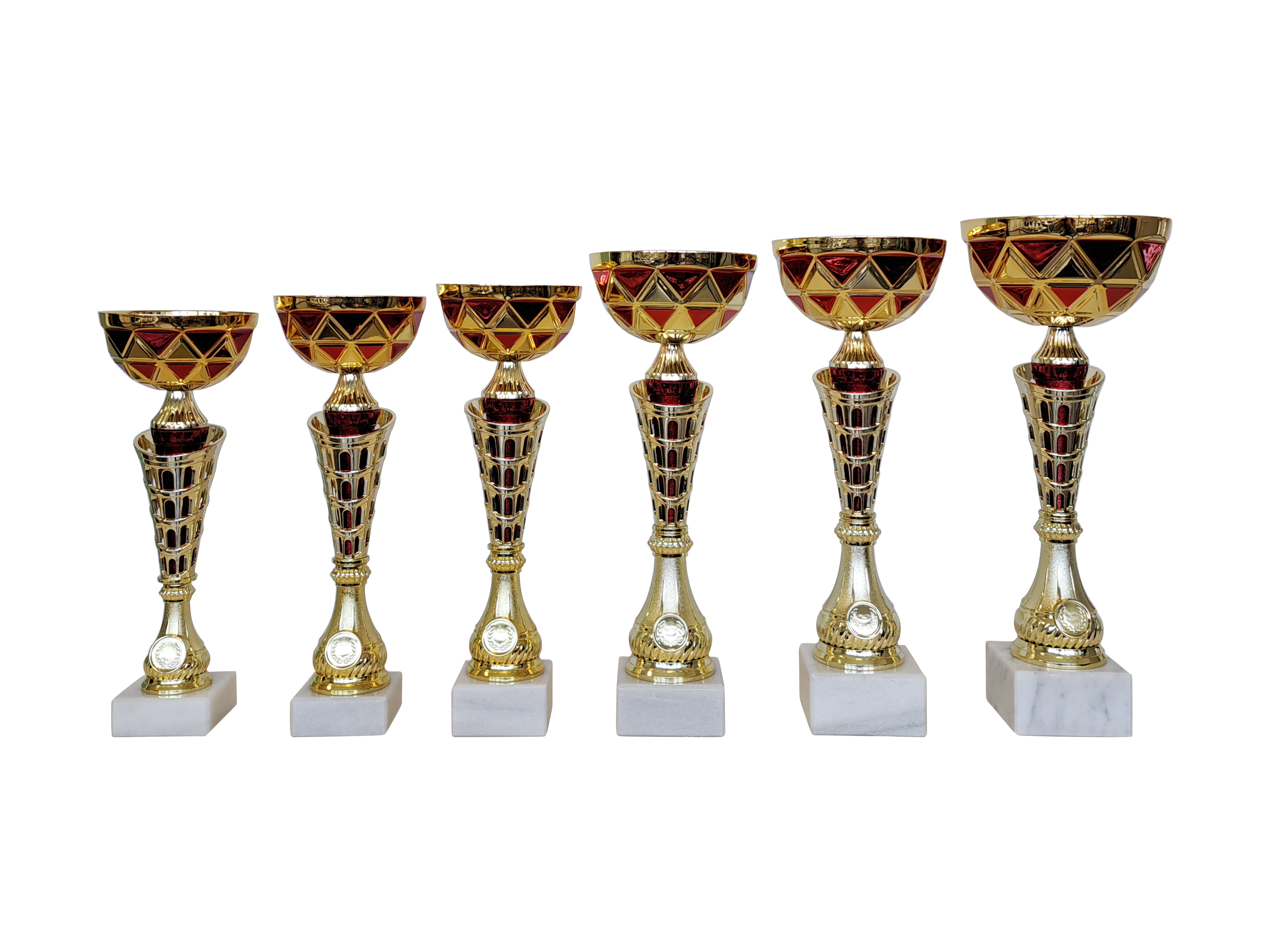 Unsere Pokalserie „ANDREA“ in Gold/Rot. Erhältlich in verschiedenen Größen und somit optimal für unterschiedliche Platzierungen. Auf Wunsch auch mit Gravurschild (am Sockel befestigt) und/oder einer Auflage.