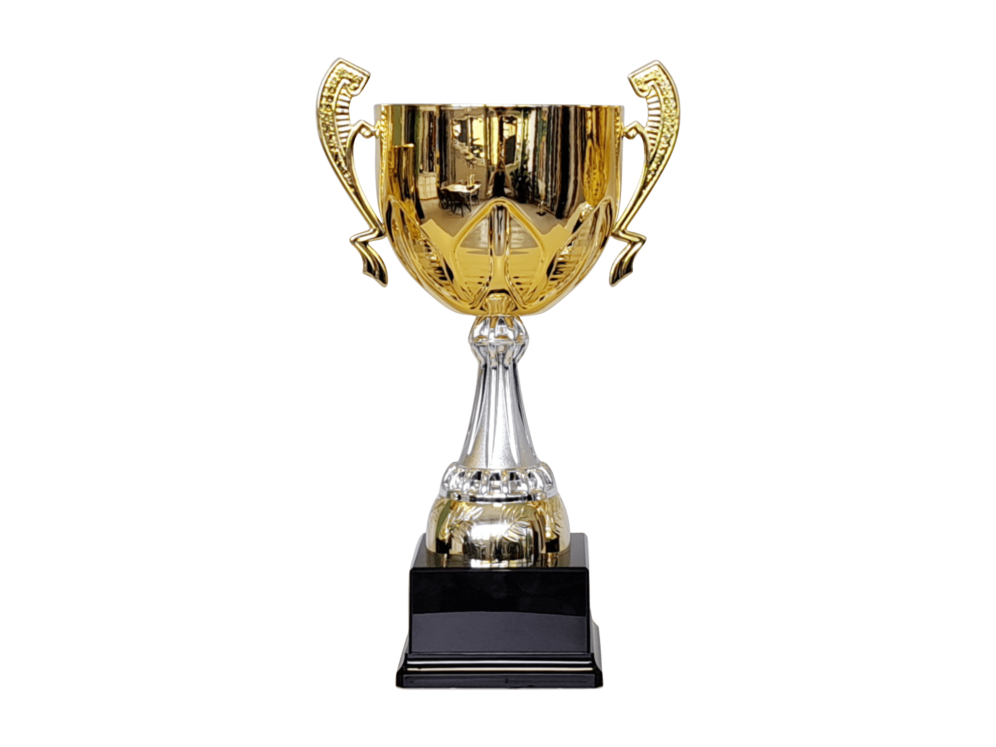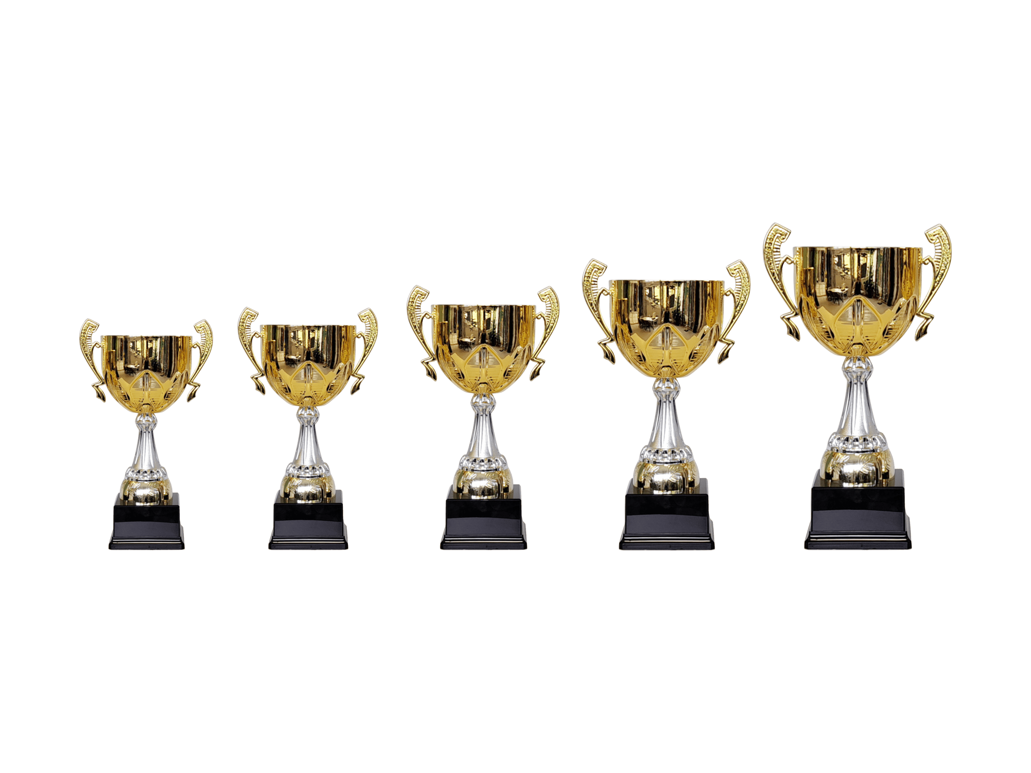 Unsere Pokalserie „DOMINIC“ in Gold/Silber. Erhältlich in verschiedenen Größen und somit optimal für unterschiedliche Platzierungen. Auf Wunsch auch mit Gravurschild (am Sockel befestigt).