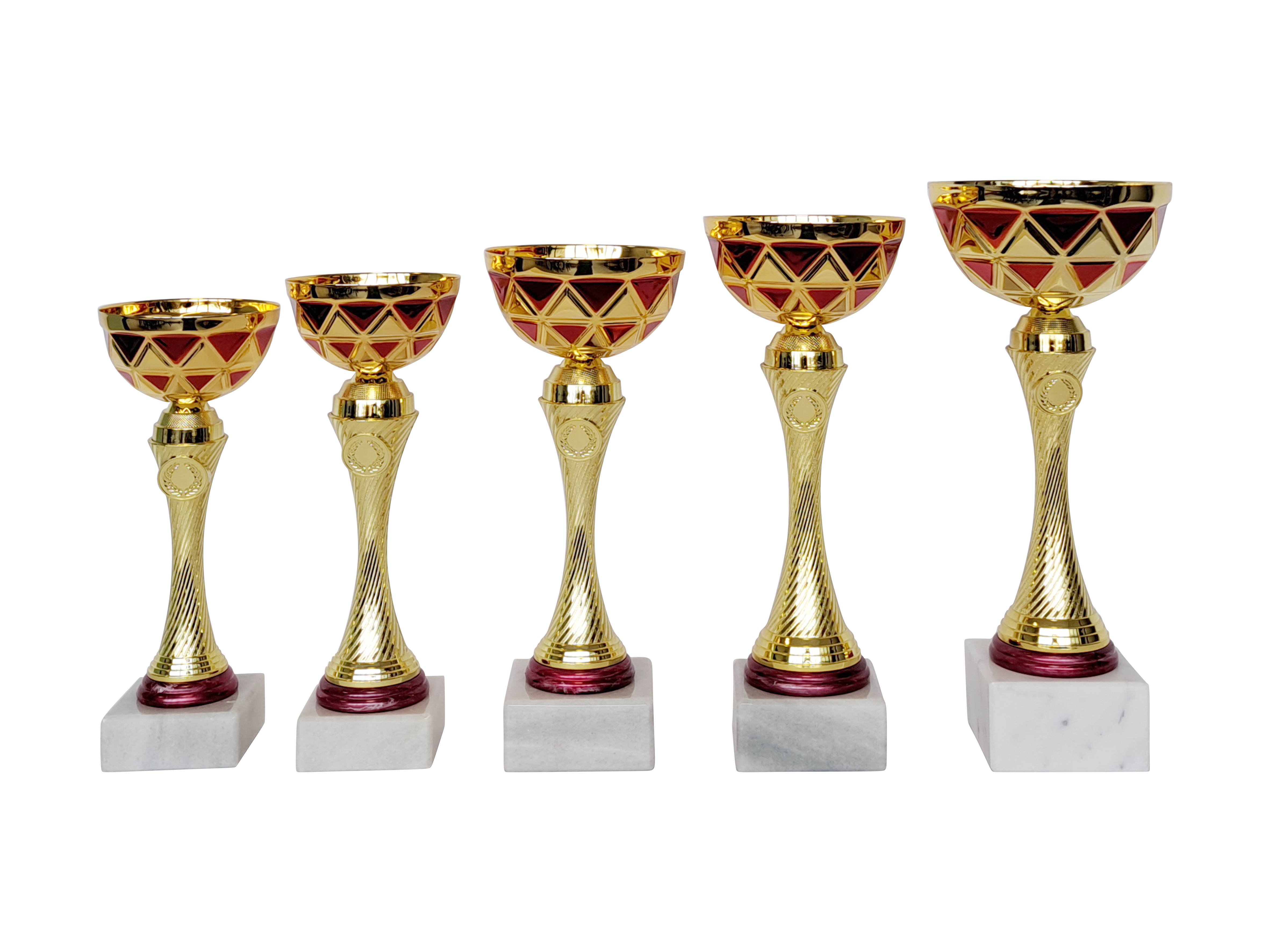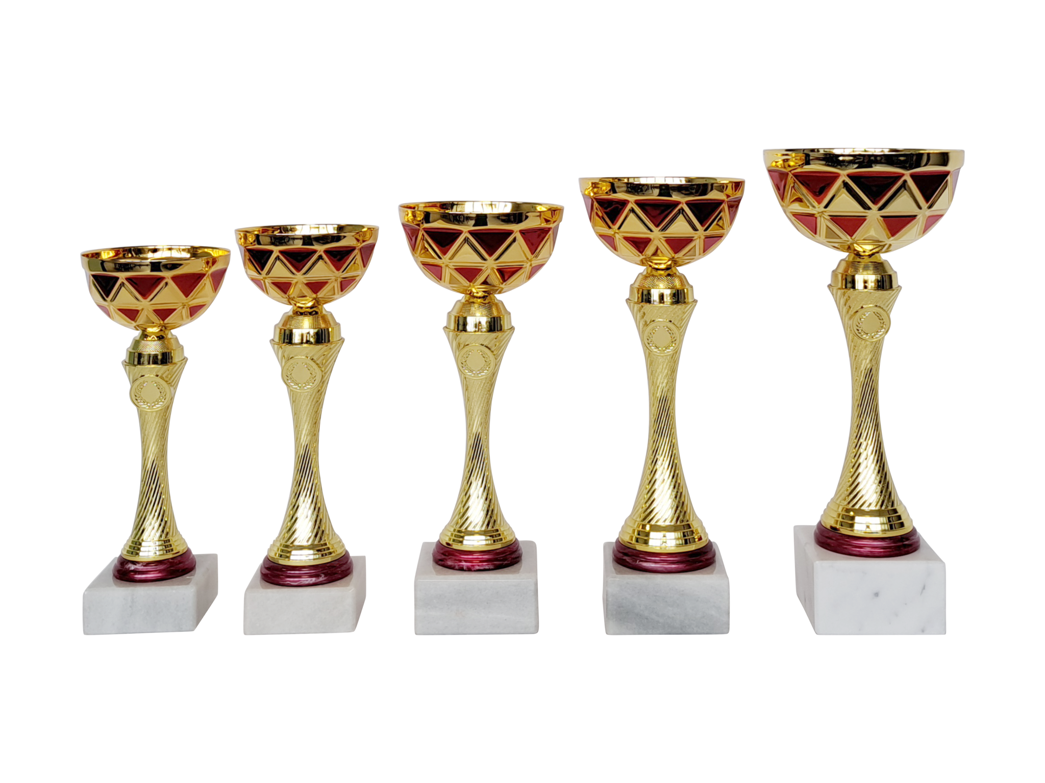 Unsere Pokalserie „FRANZ“ in Gold/Rot. Erhältlich in verschiedenen Größen und somit optimal für unterschiedliche Platzierungen. Auf Wunsch auch mit Gravurschild (am Sockel befestigt) und/oder einer Auflage.