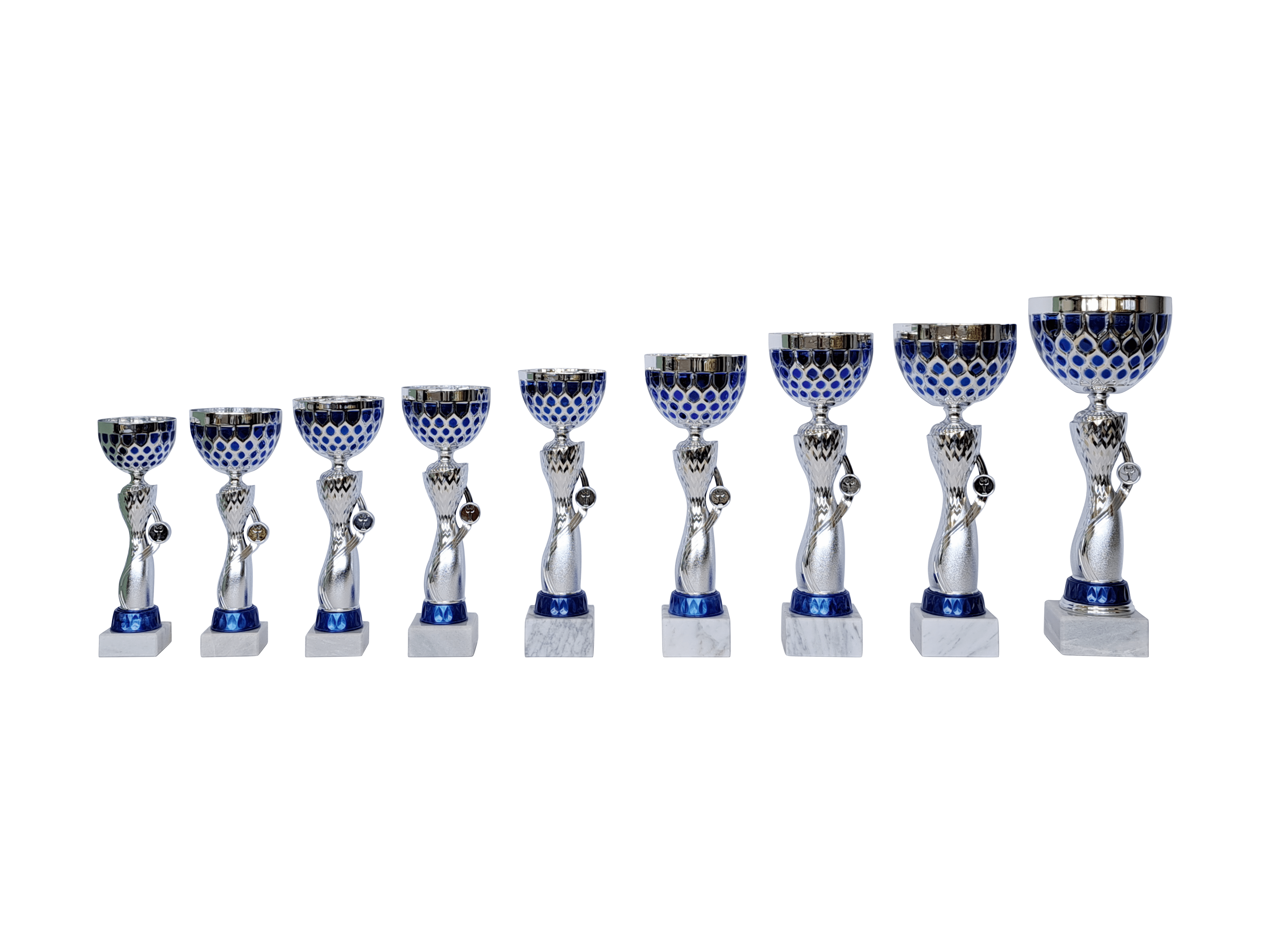 Unsere Pokalserie „FRED“ in Silber/Blau. Erhältlich in verschiedenen Größen und somit optimal für unterschiedliche Platzierungen. Auf Wunsch auch mit Gravurschild (am Sockel befestigt) und/oder einer Auflage.