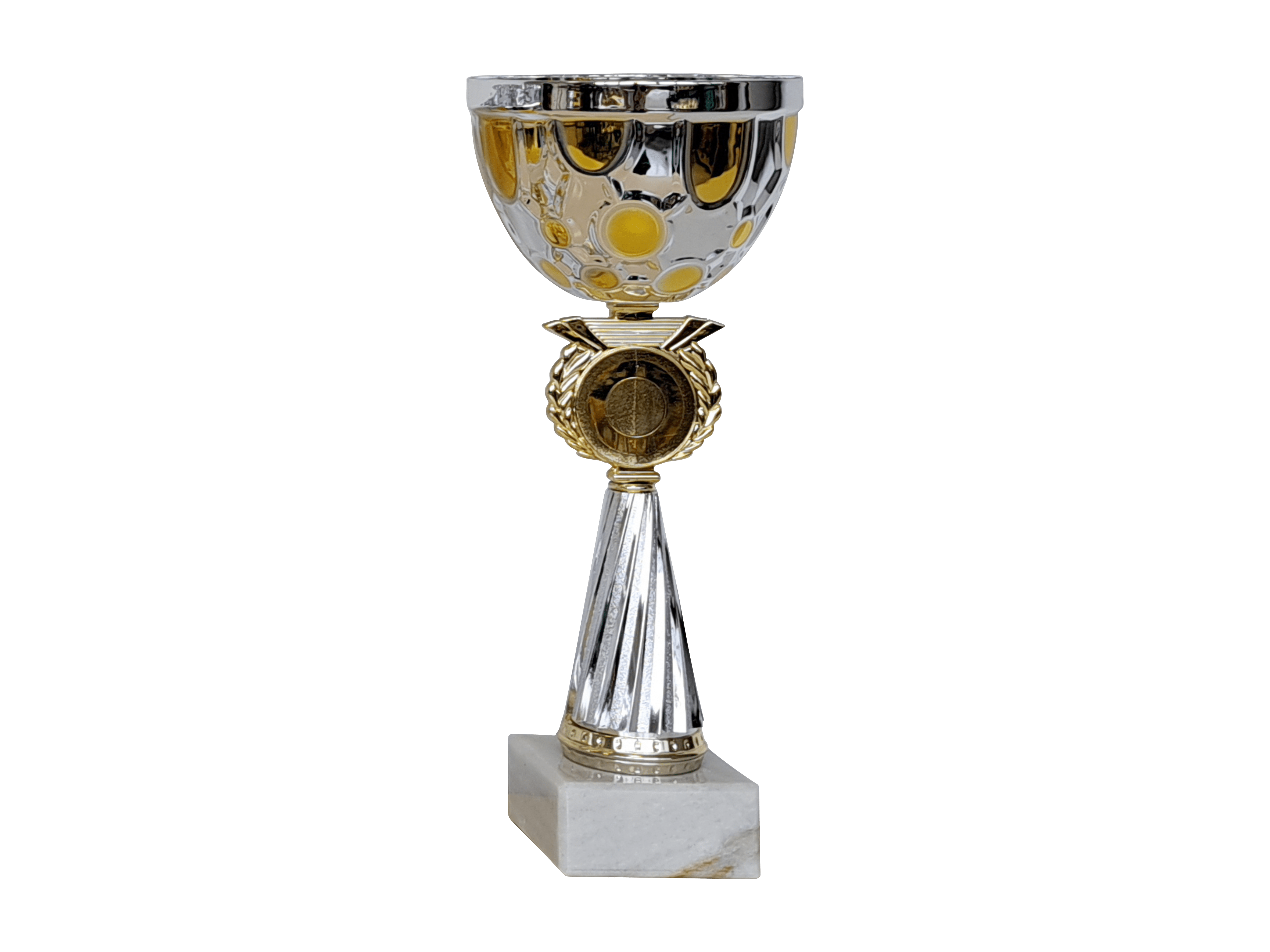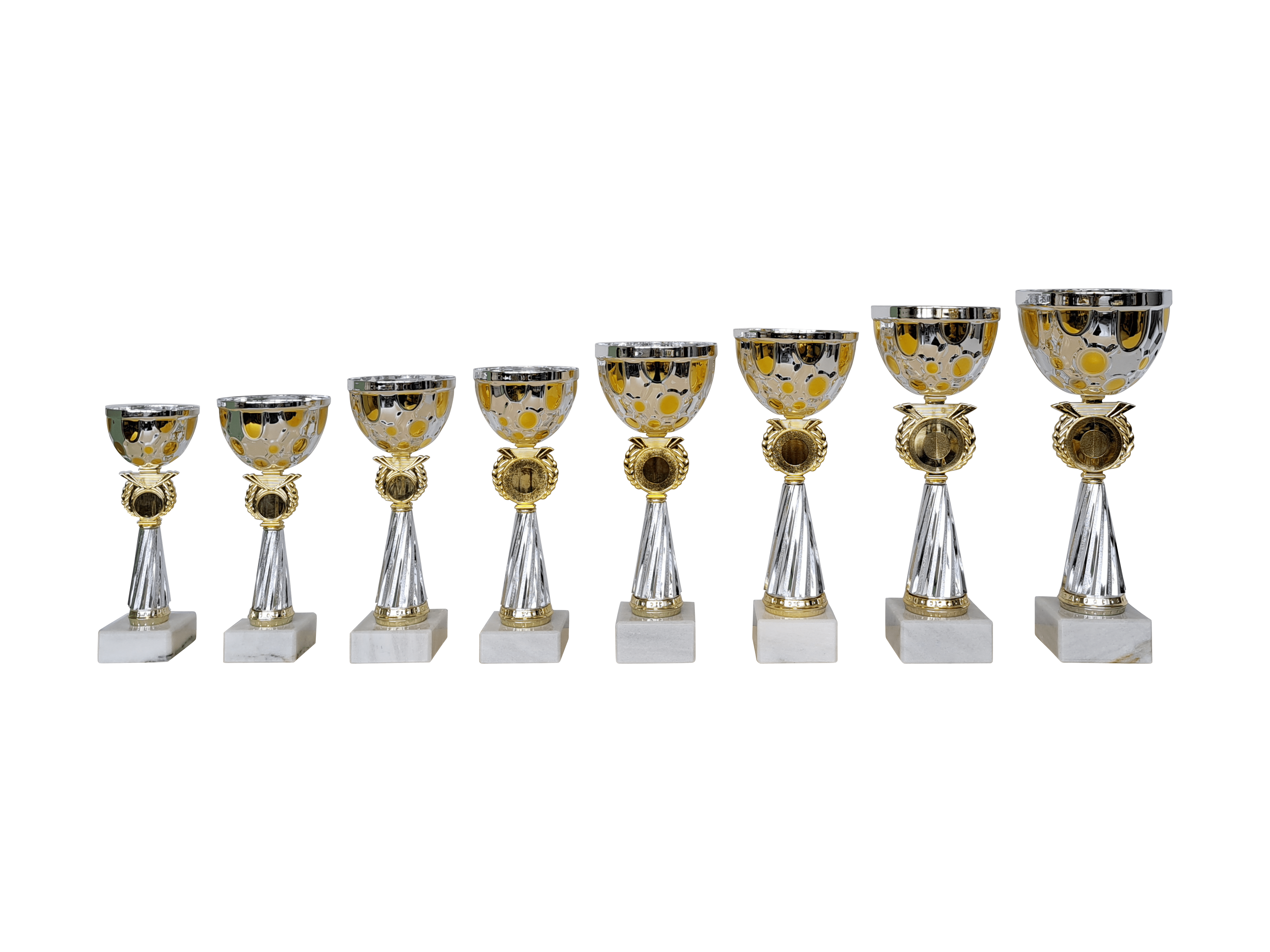 Unsere Pokalserie „HEIDI“ in Silber/Gold. Erhältlich in verschiedenen Größen und somit optimal für unterschiedliche Platzierungen. Auf Wunsch auch mit Gravurschild (am Sockel befestigt) und/oder einer Auflage.