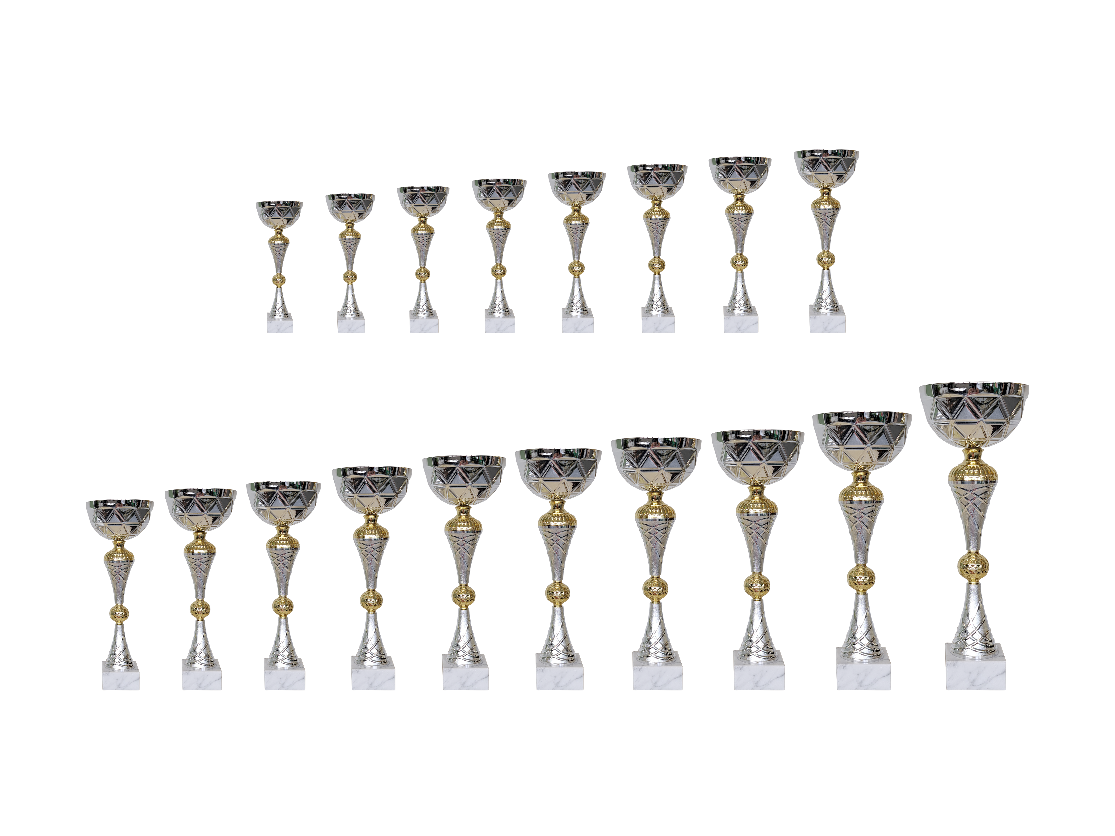 Unsere Pokalserie „HUGO“ in Silber/Gold. Erhältlich in verschiedenen Größen und somit optimal für unterschiedliche Platzierungen. Auf Wunsch auch mit Gravurschild (am Sockel befestigt).