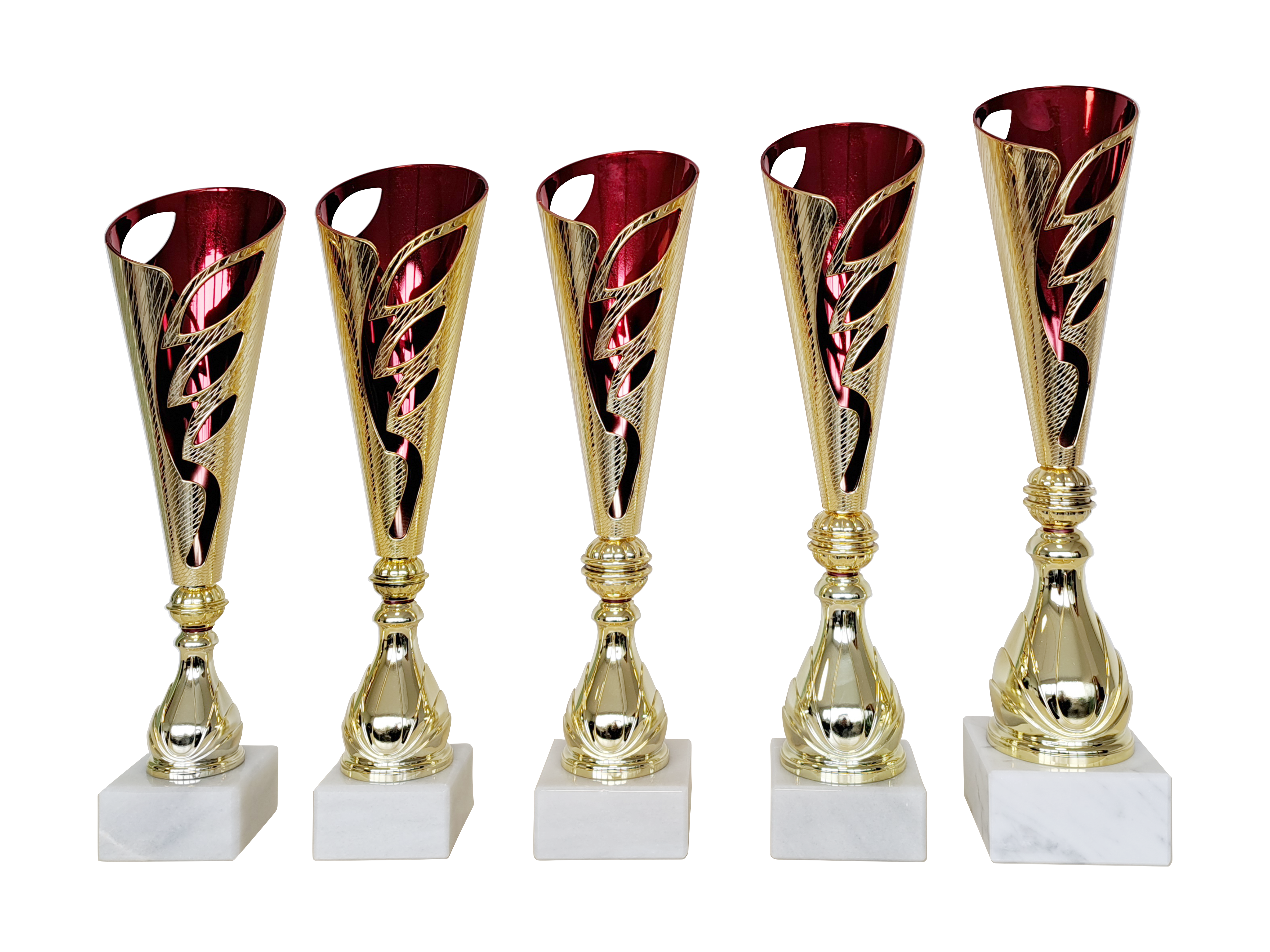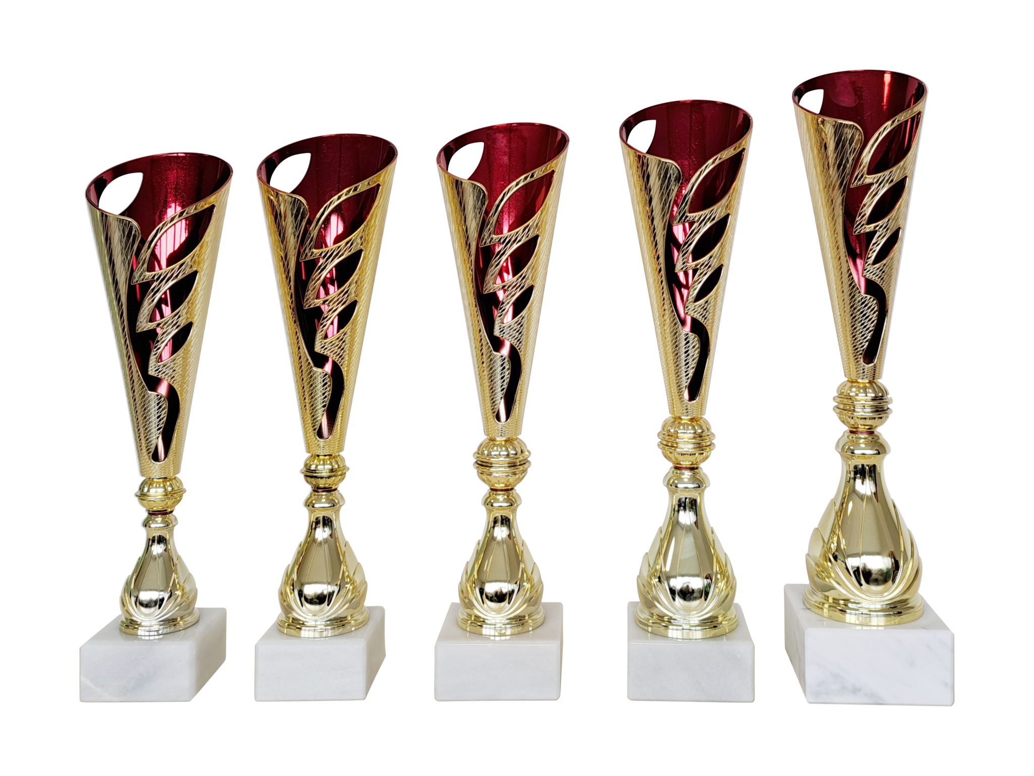 Unsere Pokalserie „LEA“ in Gold/Rot. Erhältlich in verschiedenen Größen und somit optimal für unterschiedliche Platzierungen. Auf Wunsch auch mit Gravurschild (am Sockel befestigt).