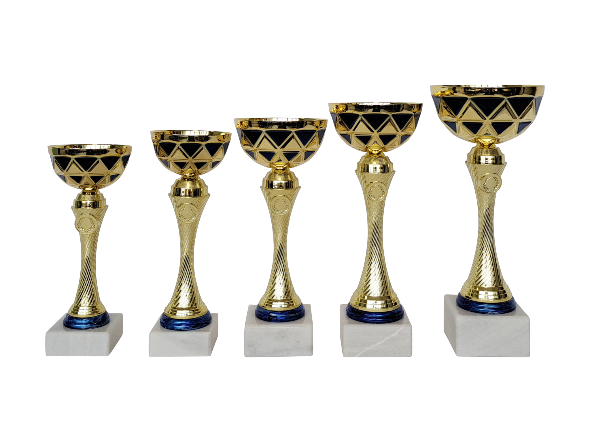 Unsere Pokalserie „MARTIN“ in Gold/Blau. Erhältlich in verschiedenen Größen und somit optimal für unterschiedliche Platzierungen. Auf Wunsch auch mit Gravurschild (am Sockel befestigt) und/oder einer Auflage.