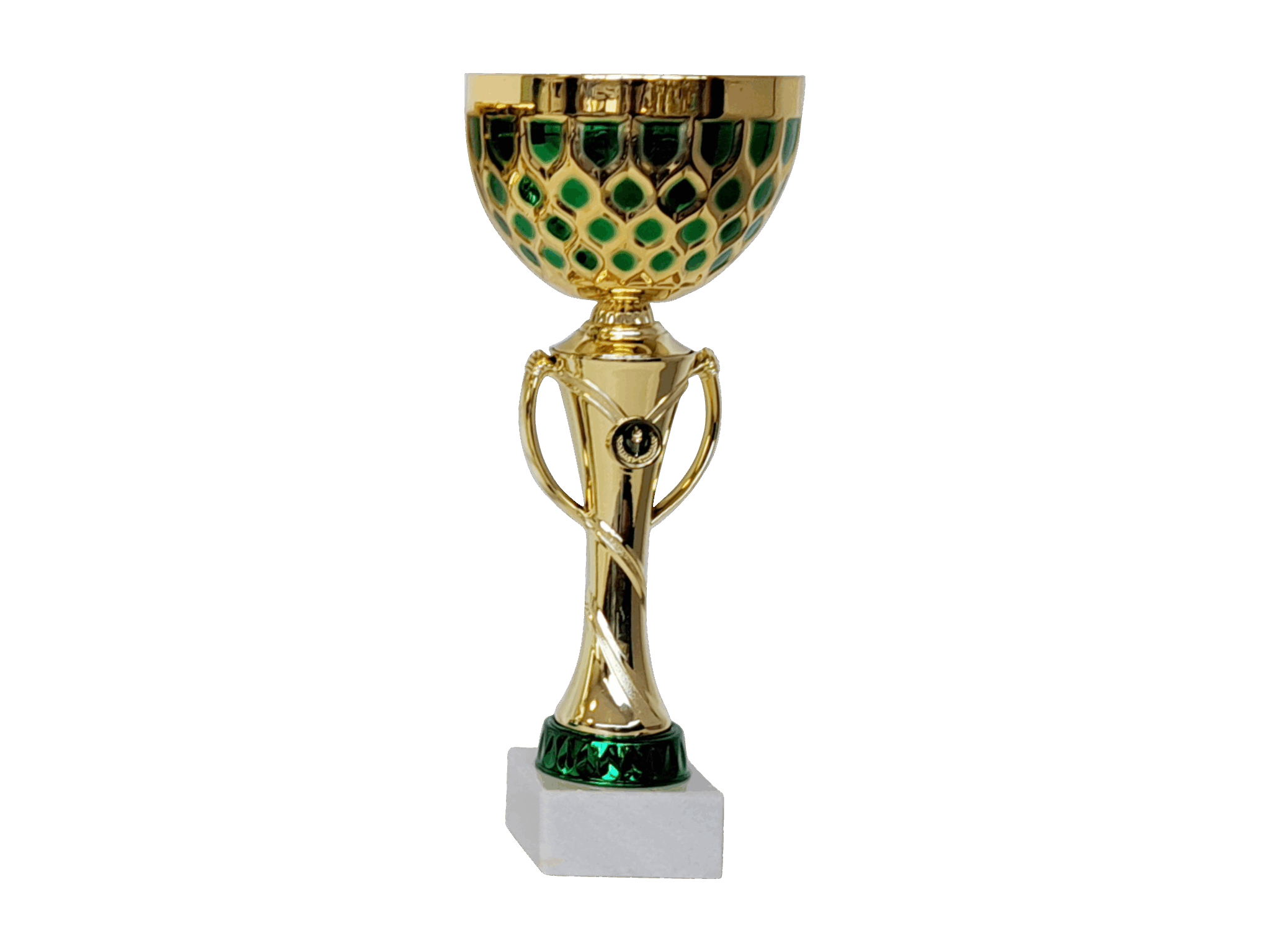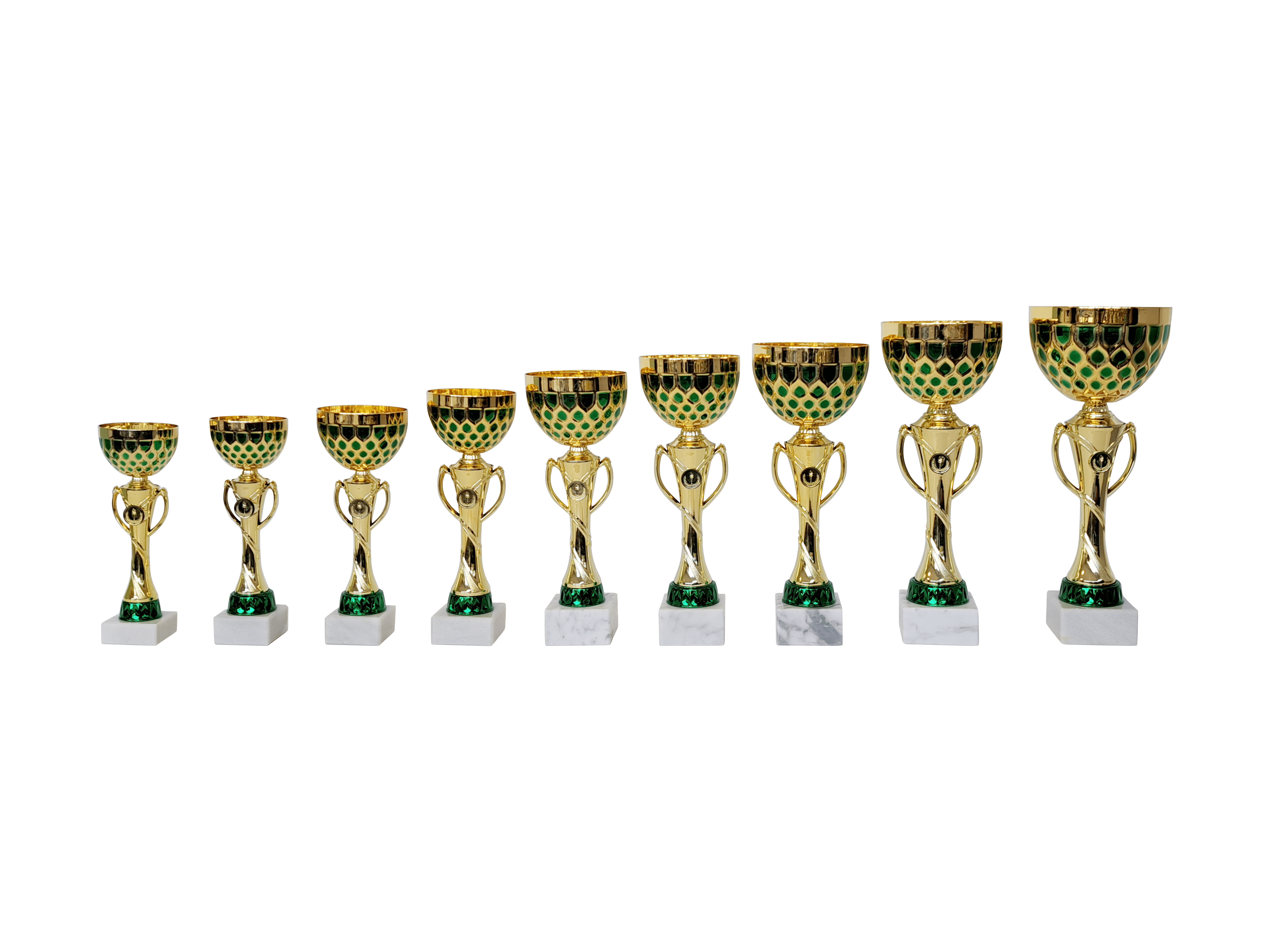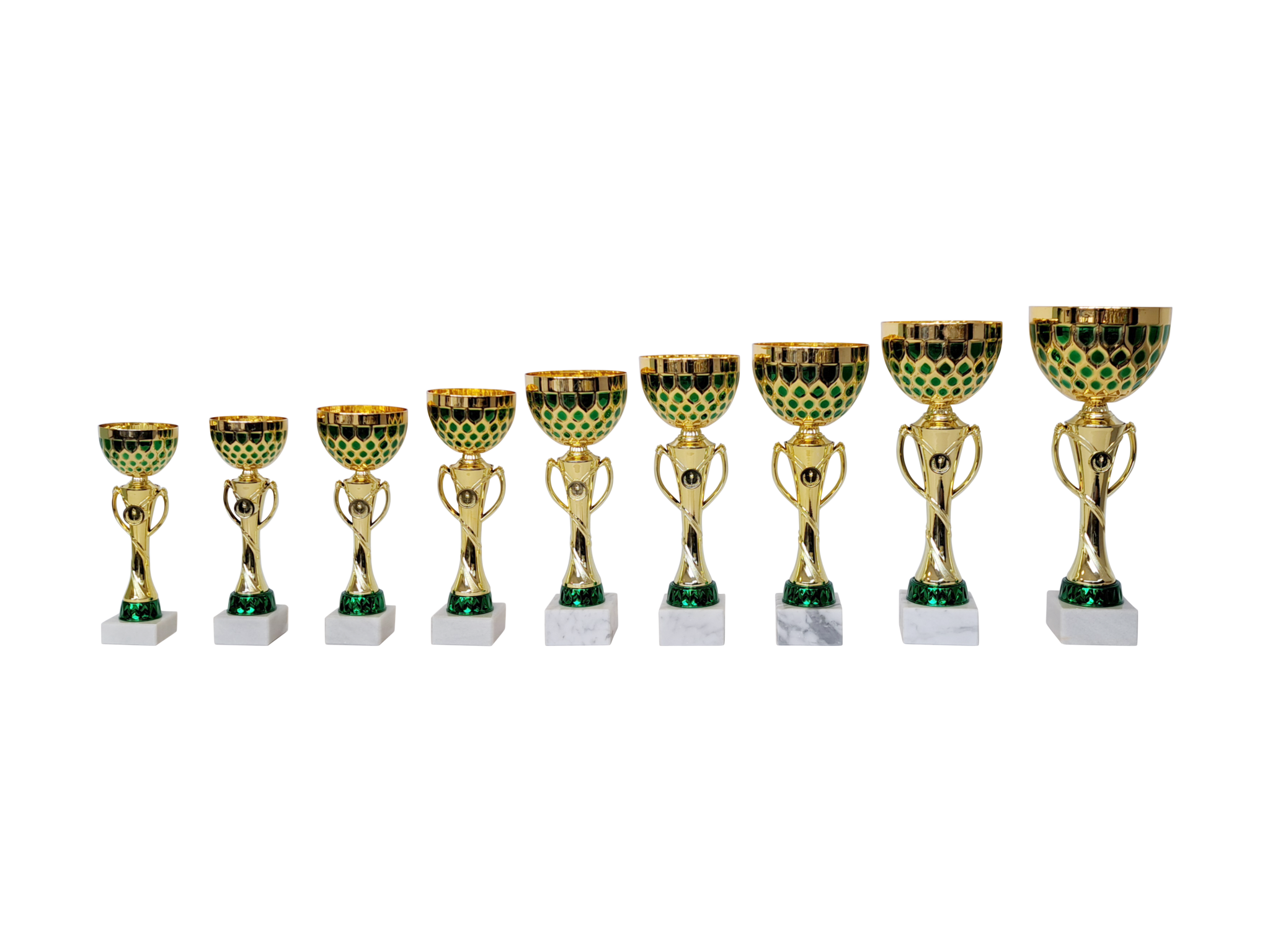 Unsere Pokalserie „MELANIE“ in Gold/Grün. Erhältlich in verschiedenen Größen und somit optimal für unterschiedliche Platzierungen. Auf Wunsch auch mit Gravurschild (am Sockel befestigt) und/oder einer Auflage.