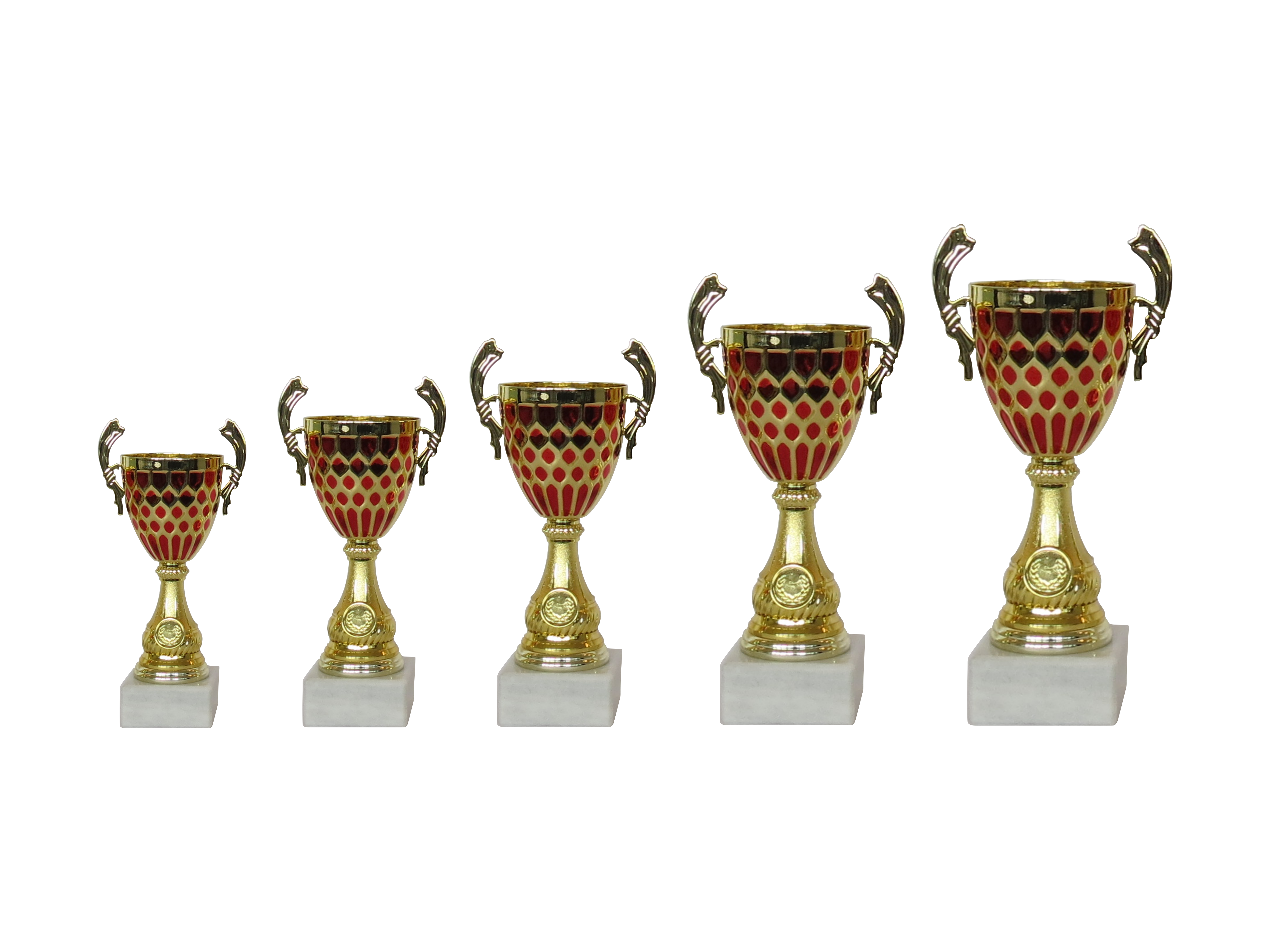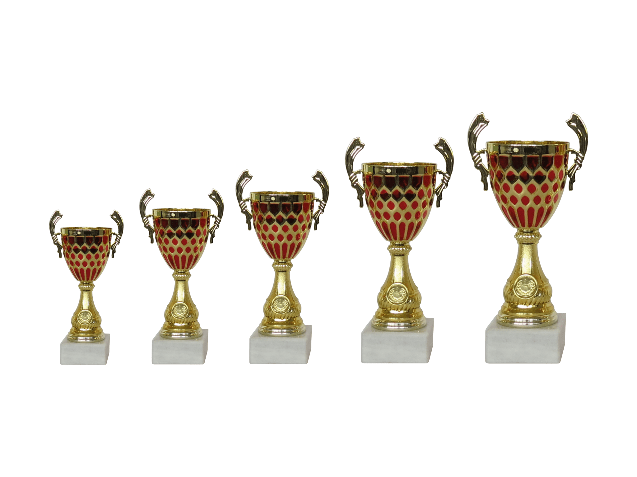 Unsere Pokalserie „MONA“ in Gold/Rot. Erhältlich in verschiedenen Größen und somit optimal für unterschiedliche Platzierungen. Auf Wunsch auch mit Gravurschild (am Sockel befestigt) und/oder einer Auflage.