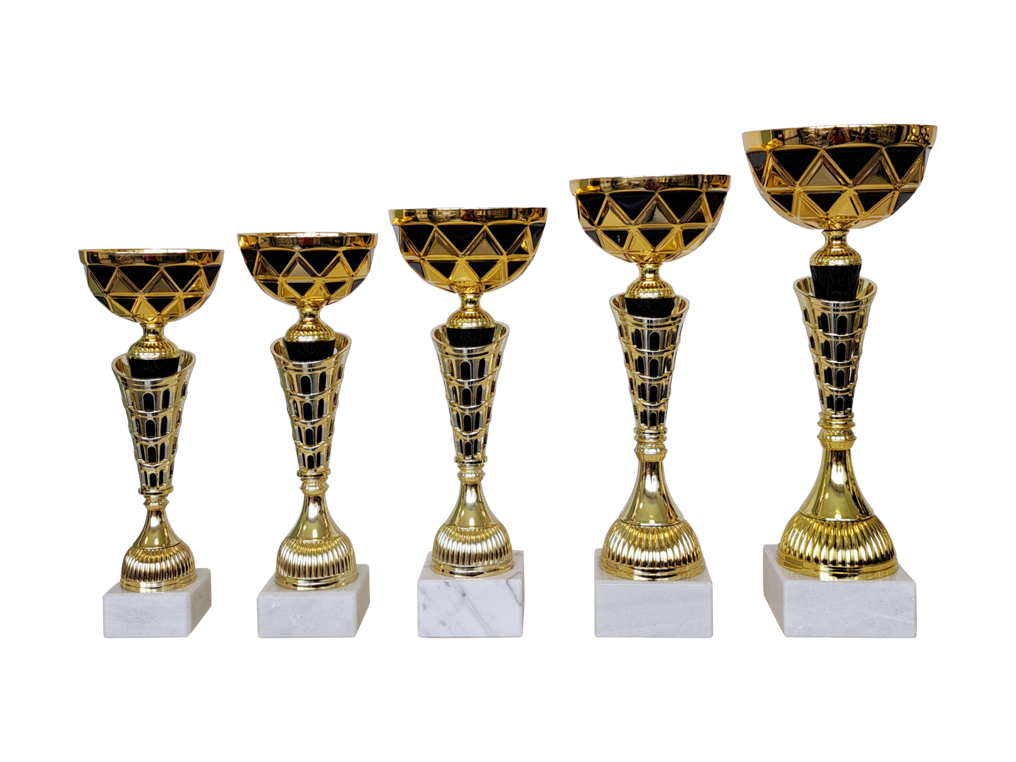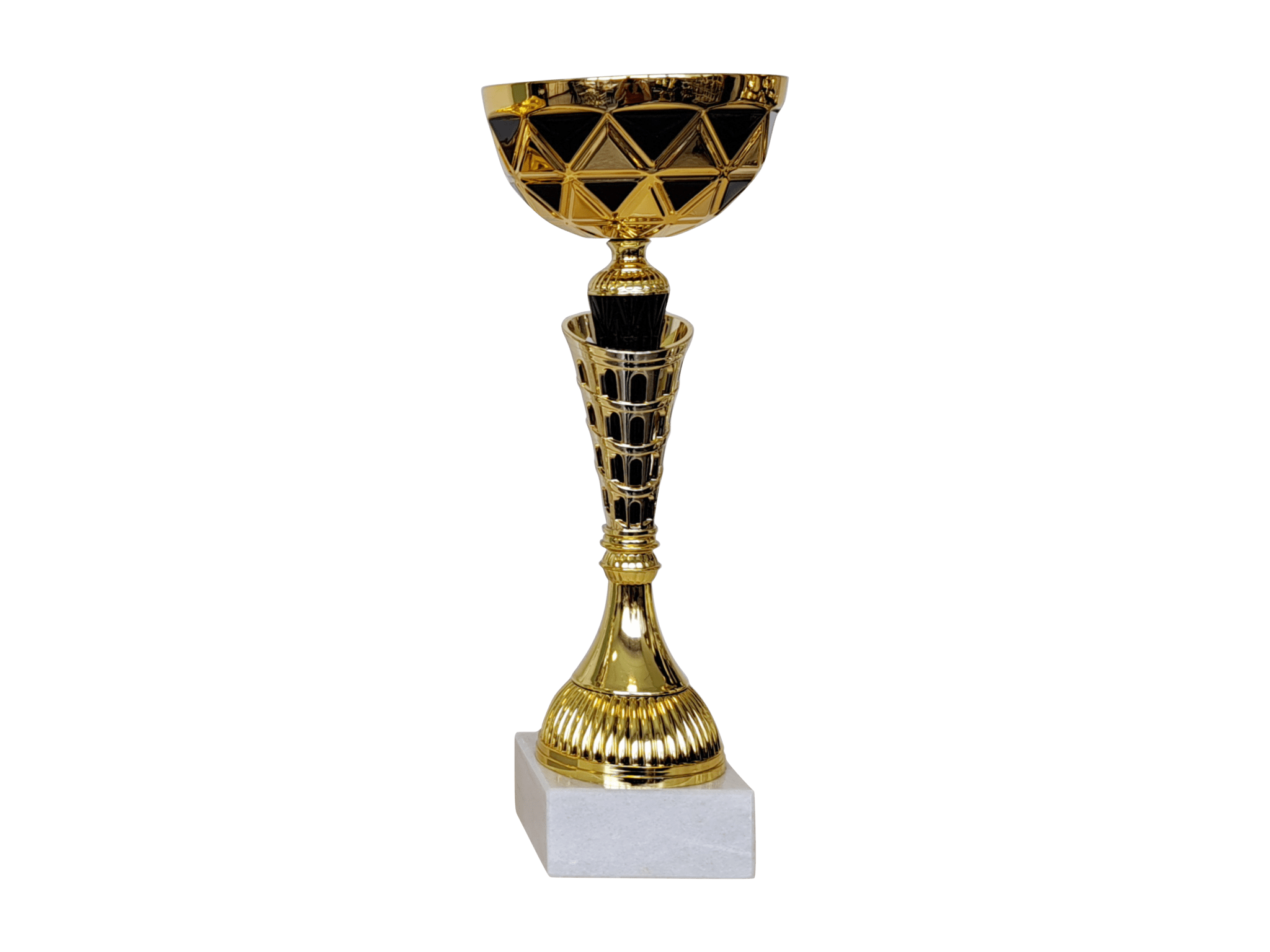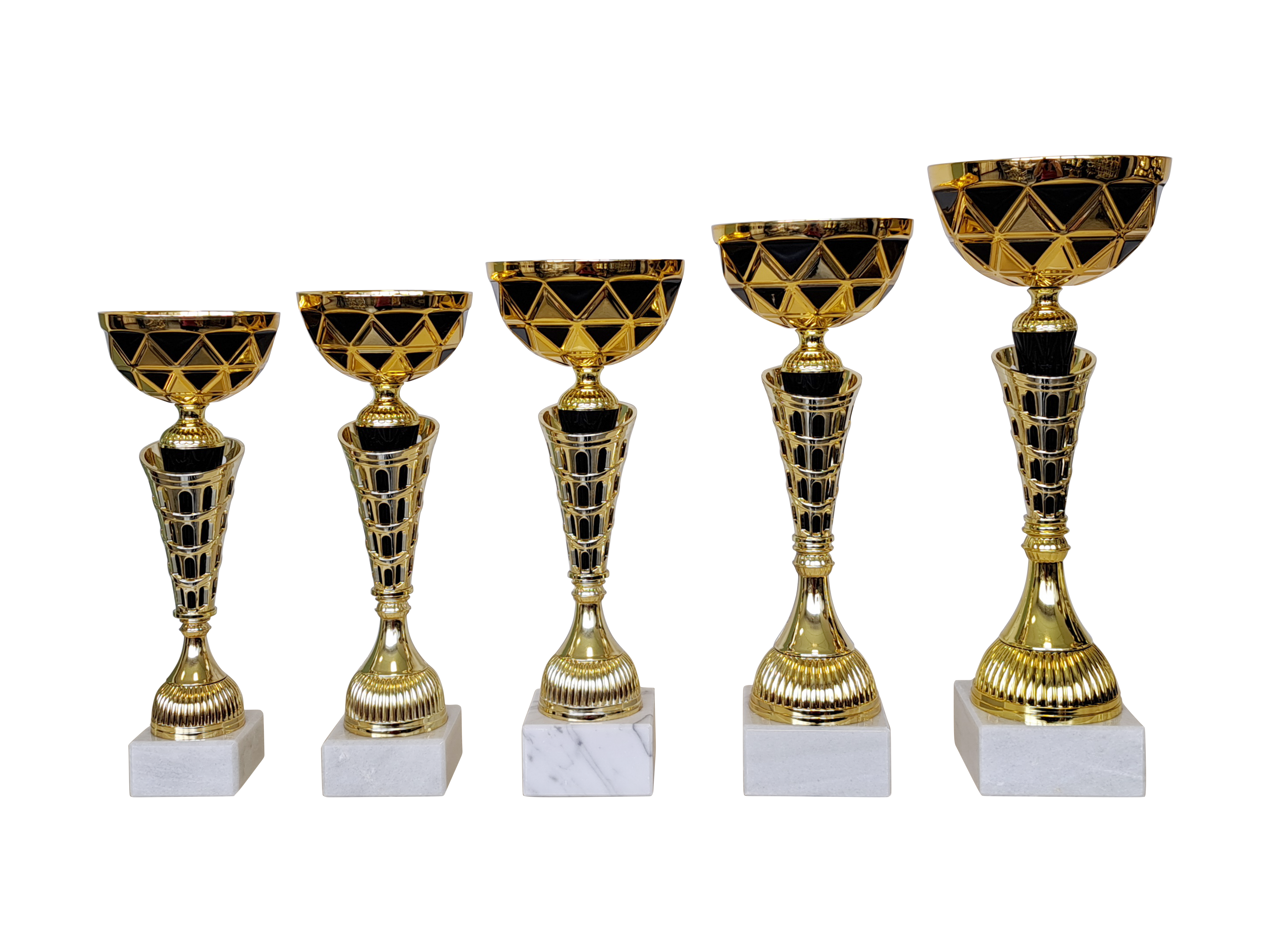 Unsere Pokalserie „NADINE“ in Gold/Schwarz. Erhältlich in verschiedenen Größen und somit optimal für unterschiedliche Platzierungen. Auf Wunsch auch mit Gravurschild (am Sockel befestigt).