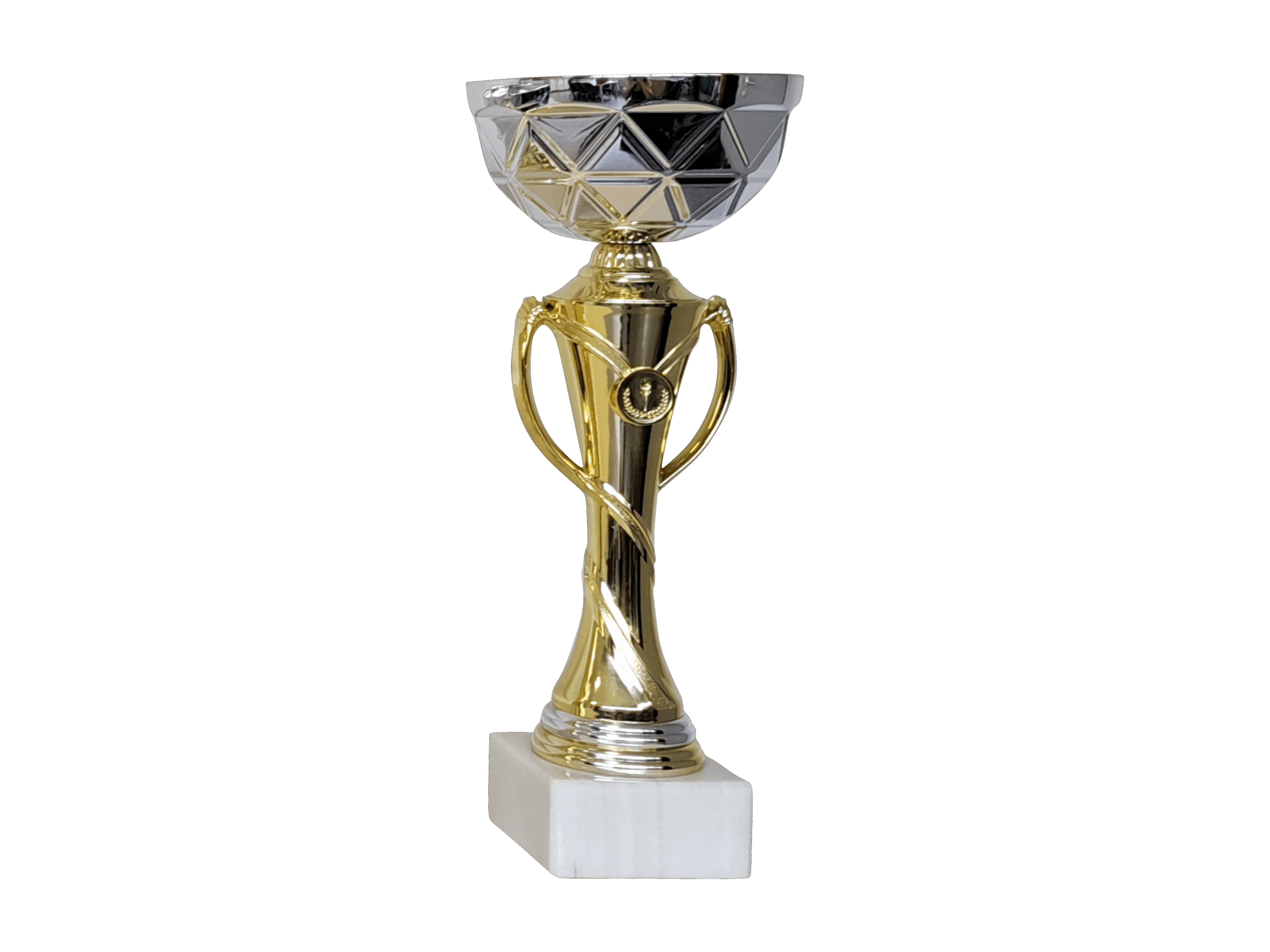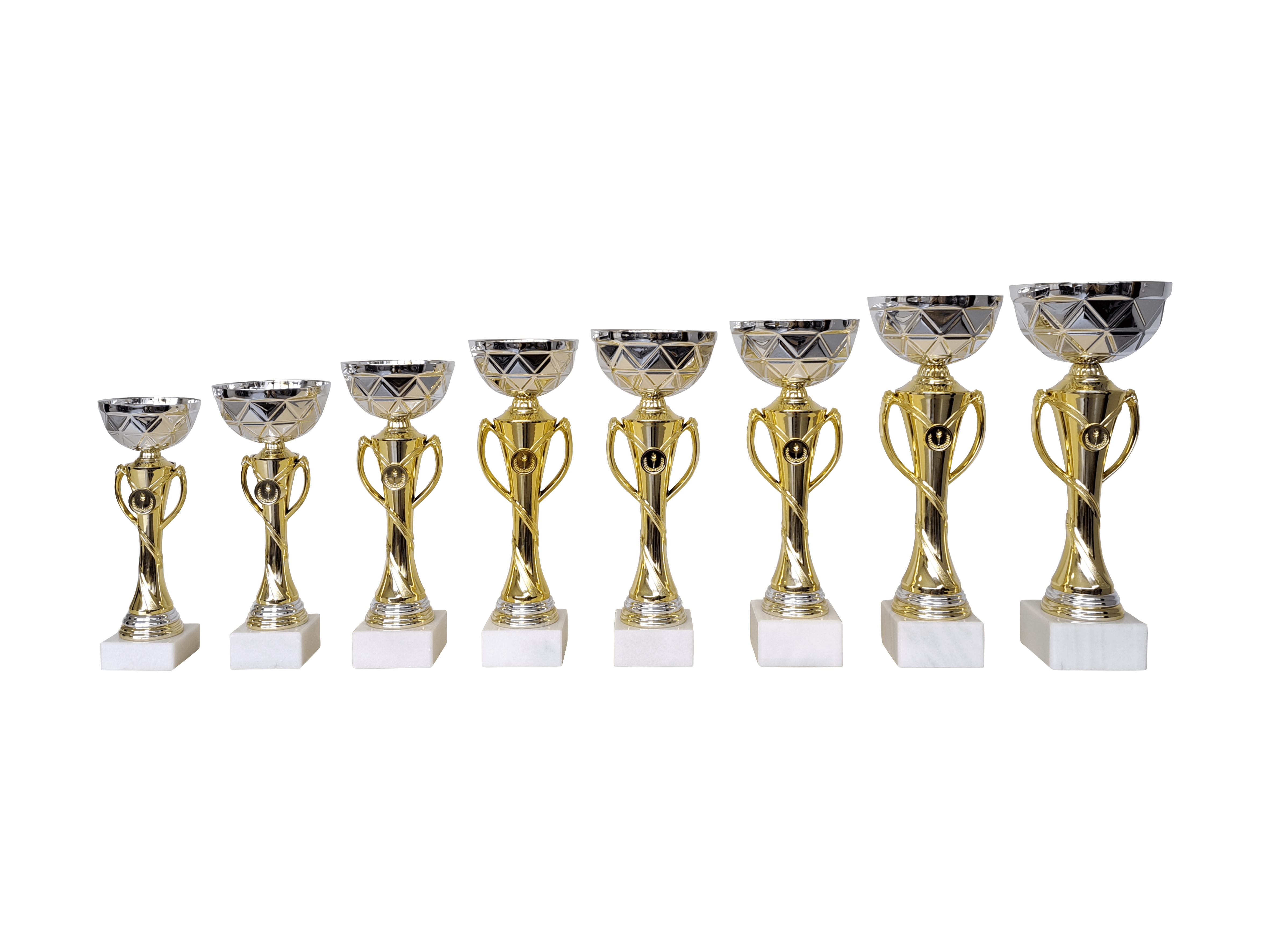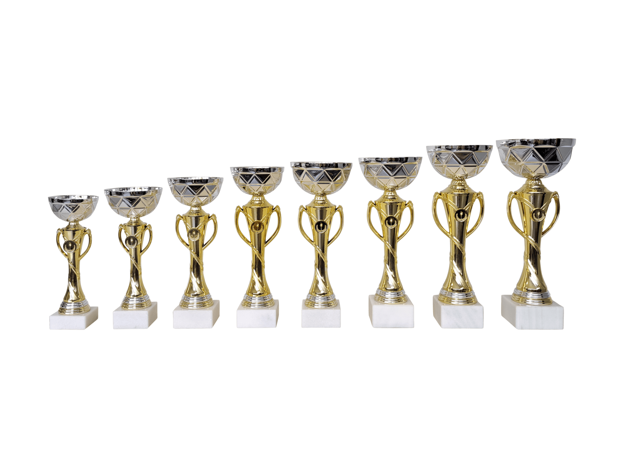 Unsere Pokalserie „RESI“ in Silber/Gold. Erhältlich in verschiedenen Größen und somit optimal für unterschiedliche Platzierungen. Auf Wunsch auch mit Gravurschild (am Sockel befestigt) und/oder einer Auflage.