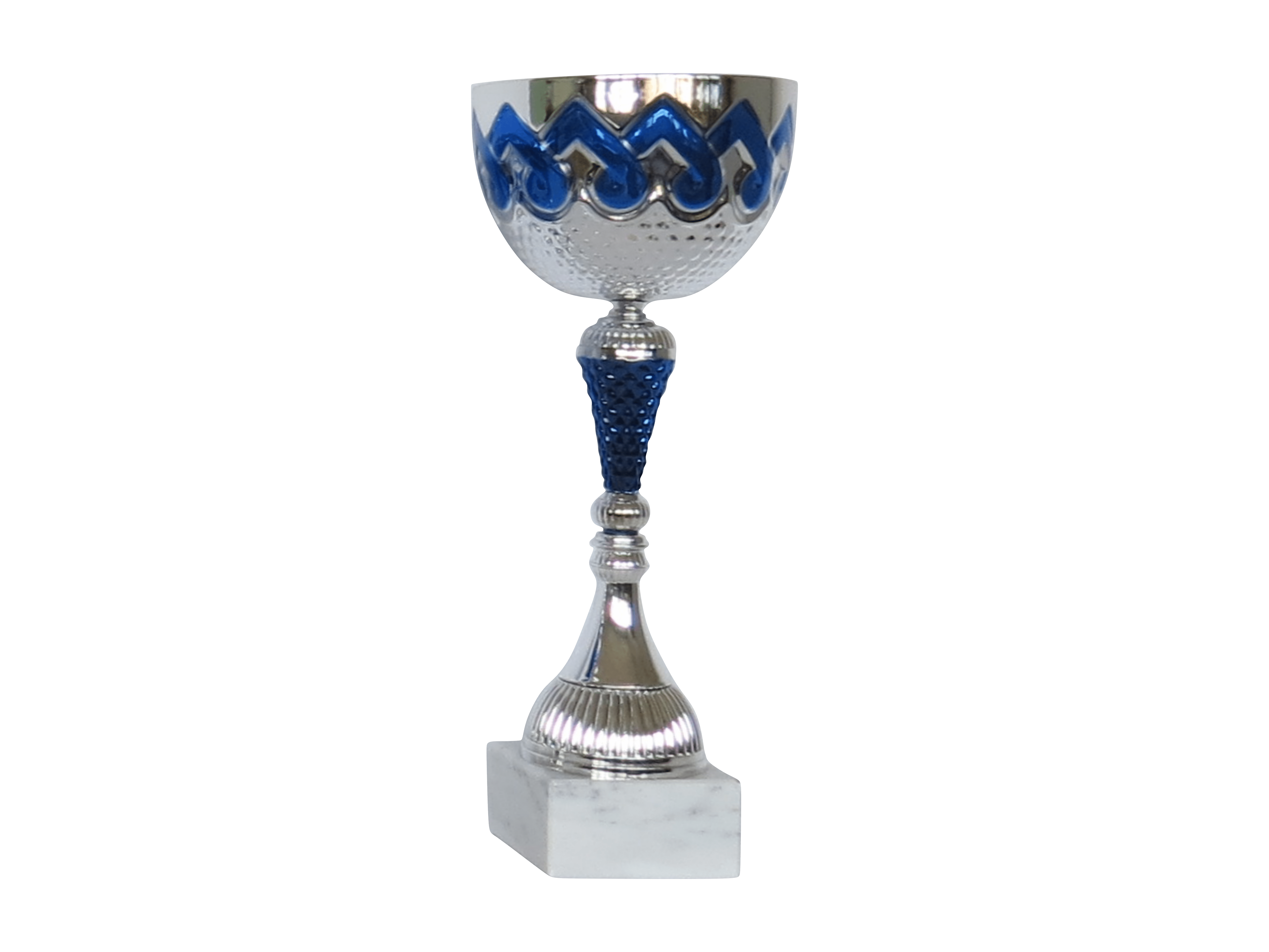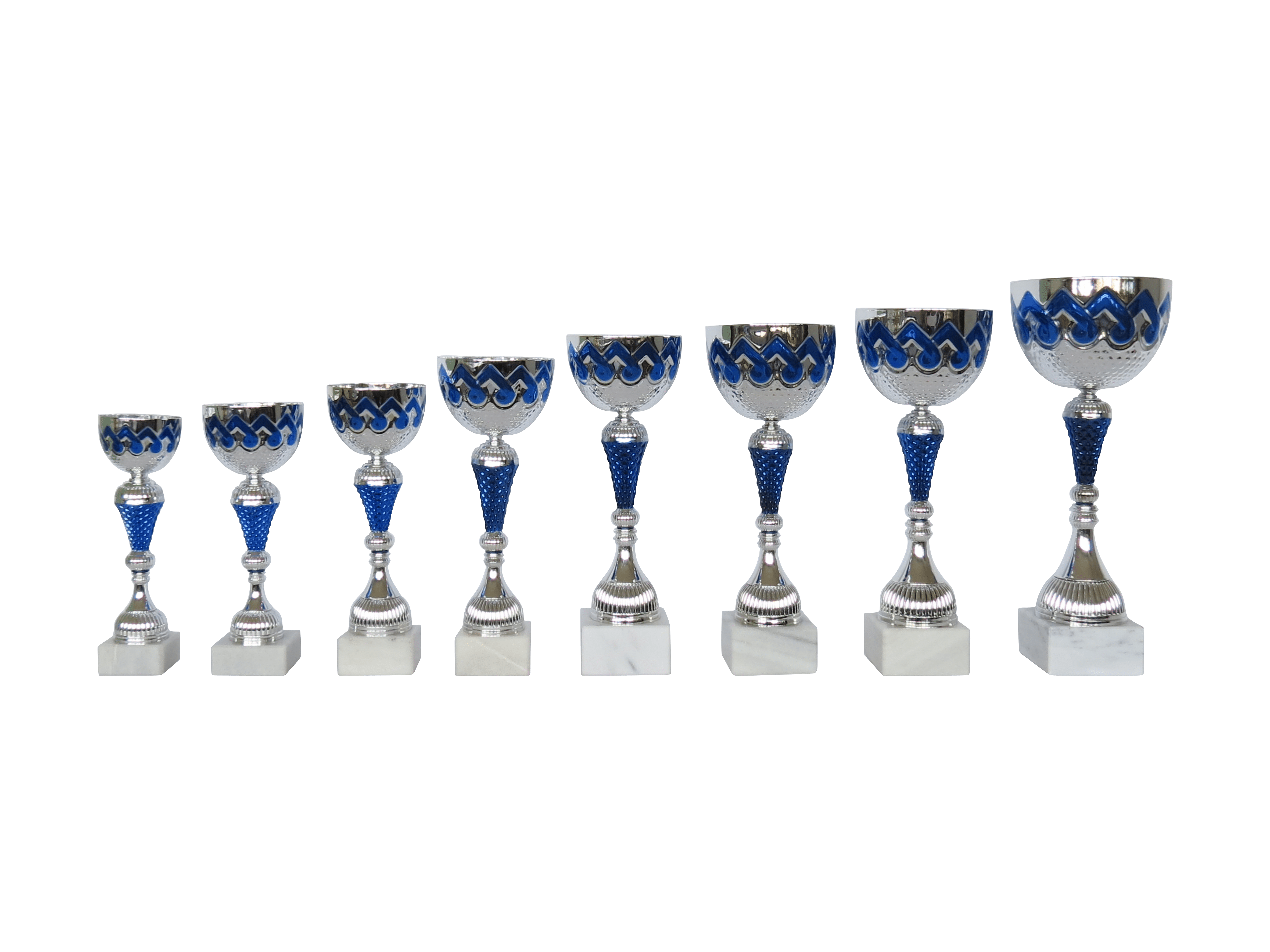 Unsere Pokalserie „ROMEO“ in Silber/Blau. Erhältlich in verschiedenen Größen und somit optimal für unterschiedliche Platzierungen. Auf Wunsch auch mit Gravurschild (am Sockel befestigt).